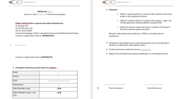 2.3. Umowa Sprzedaży z uwzględnieniem indywidualnej konfiguracji jachtu, uzgodnionego terminu realizacji oraz ceny Produktu jest udostępniana dla Klienta w siedzibie Sprzedawcy lub przesłana Klientowi wiadomością e-mail. Podpisanie przez Klienta i Sprzedawcy Umowy Sprzedaży jest potwierdzeniem zawarcia Umowy Sprzedaży. Treść Umowy Sprzedaży jest utrwalona i zabezpieczona przez Sprzedawcę i udostępniona Klientowi.