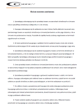 1.4.8. SPRZEDAWCA- spółka COBREY YACHTS SPÓŁKA Z OGRANICZONĄ ODPOWIEDZIALNOŚCIĄ z siedzibą w Warszawie (adres siedziby i adres do doręczeń: ul. Annopol 22b, 03-236 Warszawa); wpisana do Rejestru Przedsiębiorców Krajowego Rejestru Sądowego pod numerem KRS 0000496649; sąd rejestrowy, w którym przechowywana jest dokumentacja spółki: Sąd Rejonowy dla M. St. Warszawy w Warszawie, XIV Wydział Gospodarczy Krajowego Rejestru Sądowego; kapitał zakładowy w wysokości 100 000 zł; NIP: 5361914089; REGON: 146770934 oraz adres poczty elektronicznej: info@cobrey.pl, numer telefonu: +48 798 322 022.